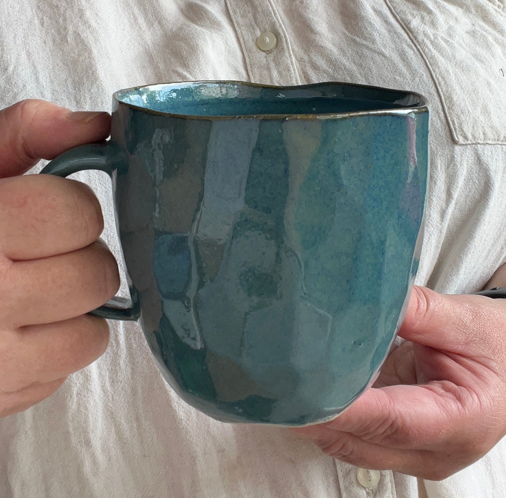 These gorgeous faceted speckled ceramic mugs are wheel thrown with iron rich stoneware clay then faceted on the outside and glazed with shiny turquoise blue glaze.  They will make the perfect addition to your tea or coffee routine.